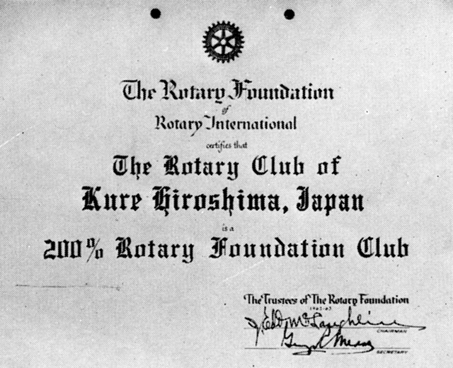 「ロータリー財団奨学基金」200%クラブとしてロータリー財団より表彰を受く。 |