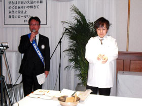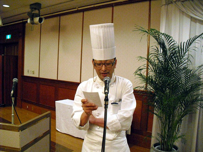 家族例会のメニュー紹介をして下さる阪急ホテル総料理長 |