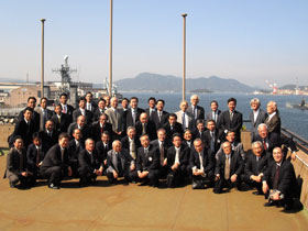 事務所屋上で記念撮影。海を見下ろし、呉らしく潜水艦や大型クレーンが。 |