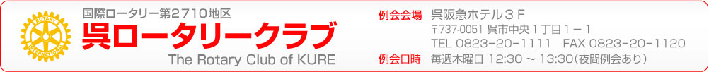 我が呉ロータリークラブは、今年創立67年目を迎えます。広島ロータリーをスポンサークラブとして、県内二番目の創立、ガバナーにおきましても、笠潤一郎、大之木隆男、真鍋欣良、大之木精二氏の4名のパストガバナーを輩出して、地区内でももっとも輝かしい伝統と実績あるクラブの一つと自認いたしております。それだけに、その伝統ある呉クラブ会長としてその運営の任に当たる重責に、改めて身の引き締まる思いです。